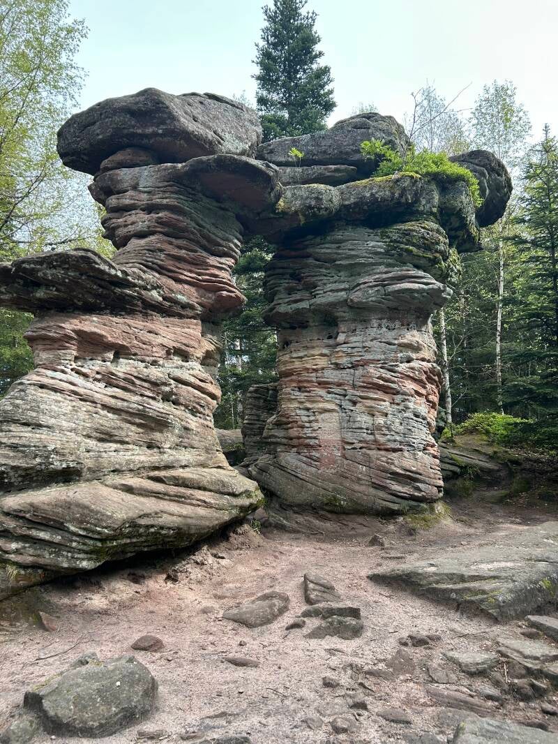 Alleen zo af en toe hebben we een doorkijkje verder lopen we de hele tijd in het bos. Vaak enorme bomen. Meest op kleine bospaadjes, vaak erg stenig en vol met boomwortels. Altijd goed opletten. Na bijna drie uur komen we bij een prachtige rotsformatie