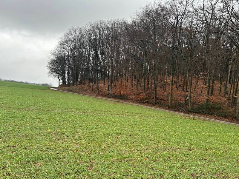 De route is weer prachtig gelegd. De eerste 10 km volgen we een heuvelrug met een bosje er op. Soms links van de rug en soms rechts. Het begint weer wat harder te regenen en ik verwissel mijn winterjas voor een regenjas. Dat is weliswaar een ademende jas maar nu word ik vanbinnen nat in plaats van vanbuiten.