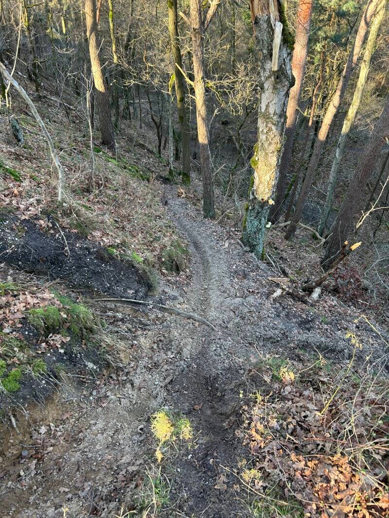 Het grenswoud. De komende 15(!!) km volgen we de grens. Beurtelings in NL beurtelings in DE. Prachtig!! Lings van ons de Maasvallei en rechts de steile "Bruch" zoals ze dat in Duitsland noemen.